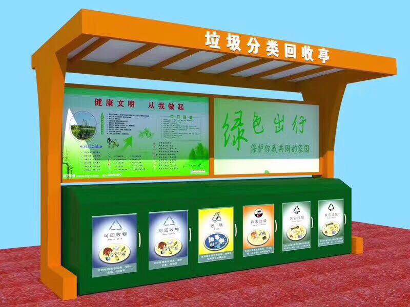 垃圾分类亭,主体分为地基基础设施、公益宣传栏、立柱、顶棚等,用于分类收集广大群众的生活垃圾。居民是城市环境保护和垃圾分类的主体力量,在垃圾收集亭上注明回收的类别和简要使用说明,指导市民使用,可以使垃圾亭也可以成为“垃圾分类”的宣传载体,把垃圾分类的好处和意义向市民宣传,提高市民环保保护意识。除此之外垃圾分类亭也可作为企业广告的载体。